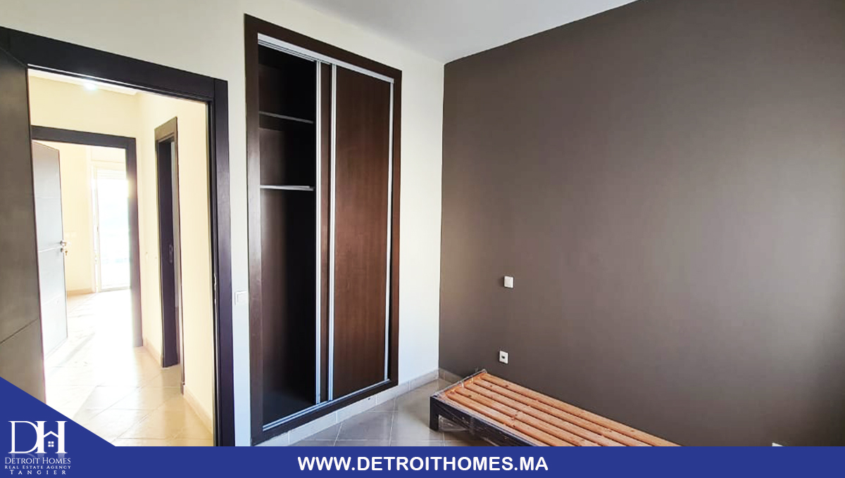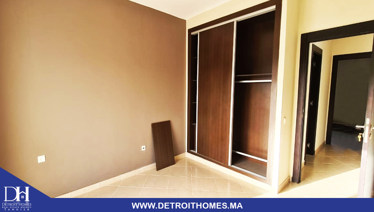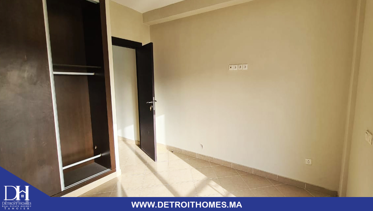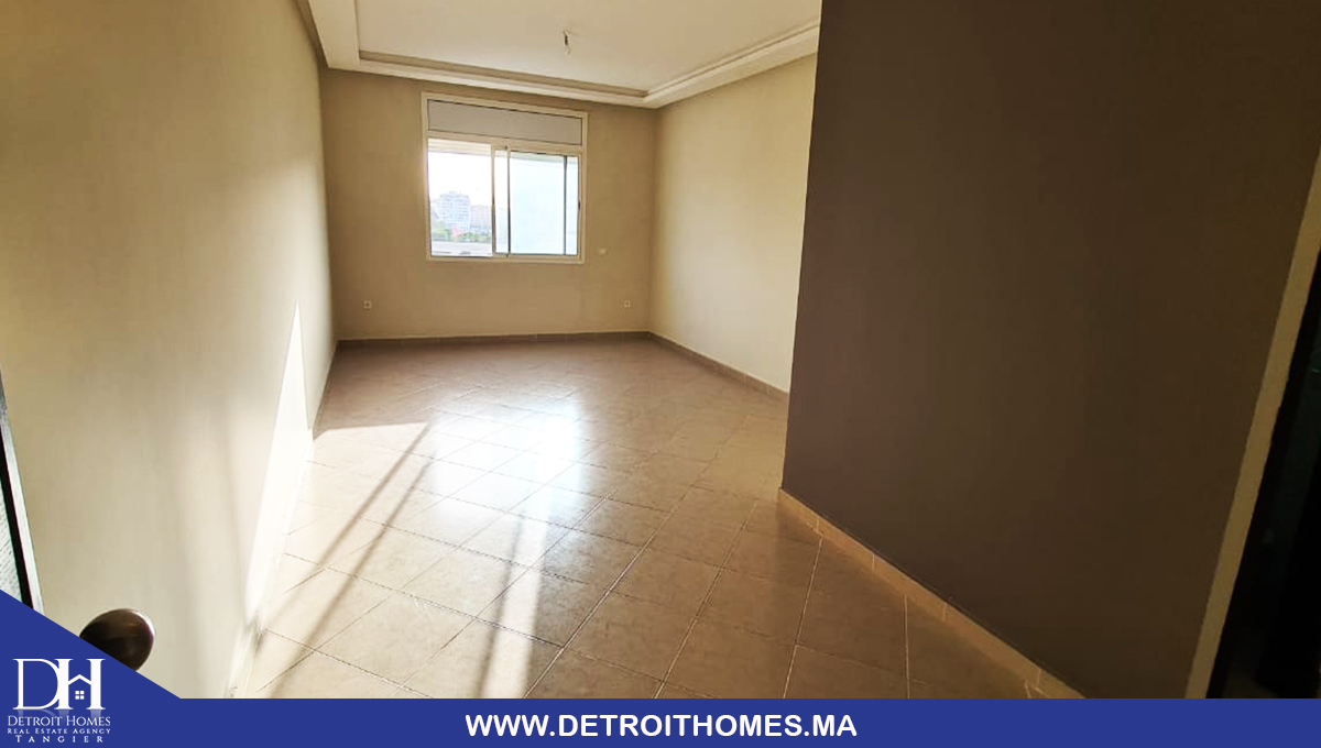 L'agence immobilière Detroit Homes de Tanger met à votre disposition un appartement vide trés bien ensoleillé à la location longue durée situé au complexe Lotinord, avec une superficie de 78 m² il se compose de 2 chambres à coucher, une cuisine avec buanderie, un salon, une salle de bain, une salle d'eau, un balcon avec une trés bonne orientation. la complexe dispose d'un jardin et espace de jeux pour enfant avec une sécurité optimale. idéale pour un jeune couple avec enfant.
